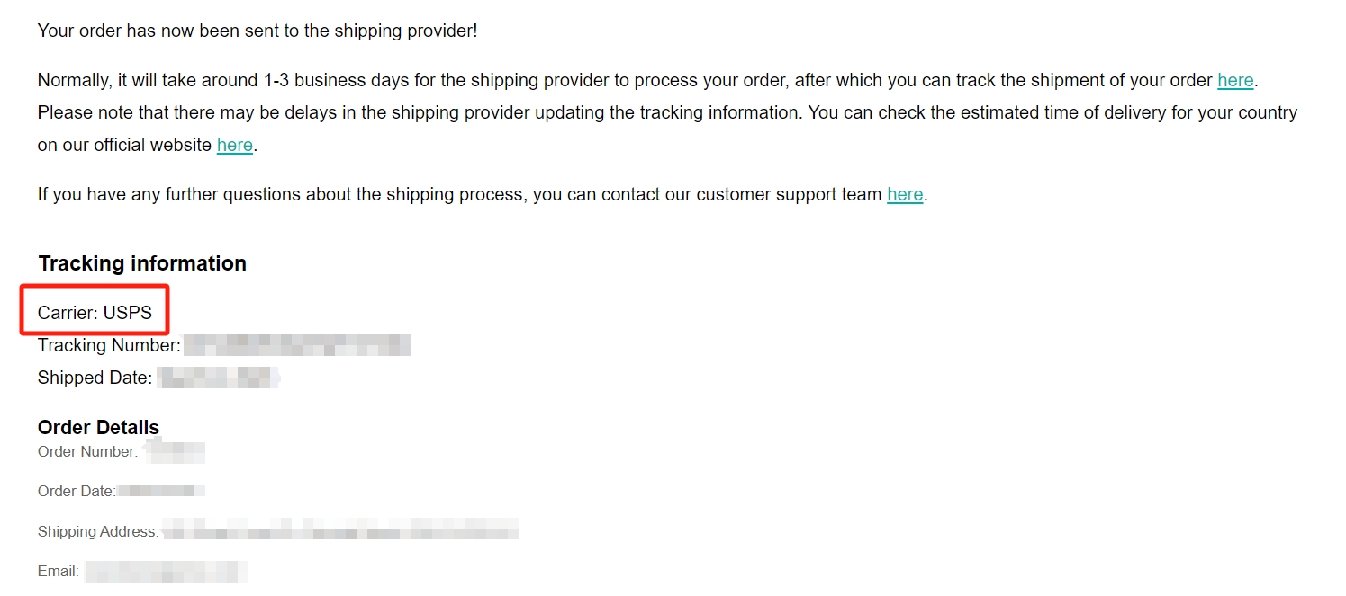 3. The item you purchased is out of stock in your local warehouse and is being shipped from a warehouse overseas. It has not yet reached your country/state and you will need to switch to an overseas carrier mentioned in your shipping email (please refer to the picture below).